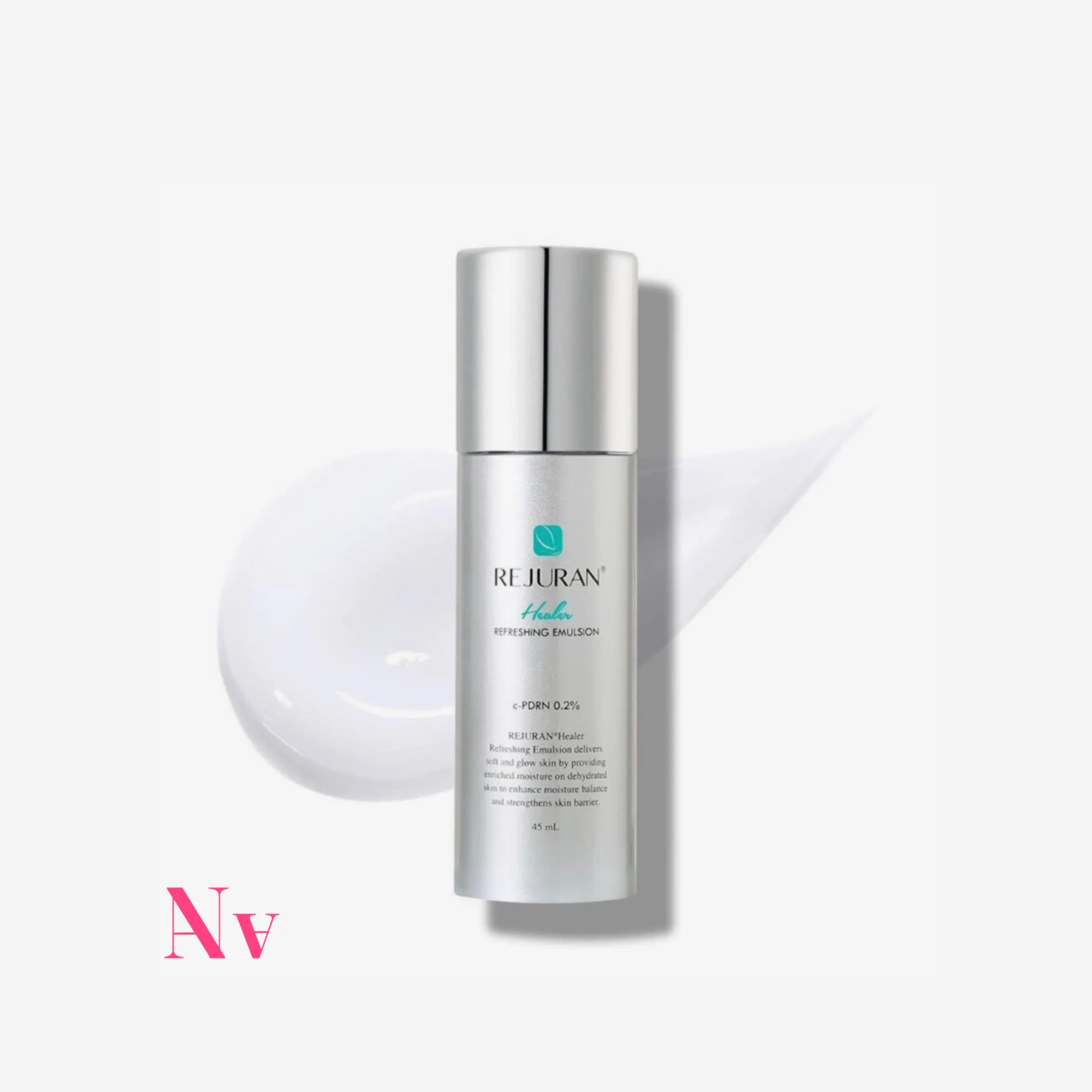 آبرسان و ترمیم کننده رجورانامولسیون ریجوران هیلر (Rejuran Healer Refreshing Emulsion) با ترکیب ویژه c-PDRN 0.2% رطوبت عمیق به پوست میرساند، سد دفاعی پوست را تقویت کرده و به حفظ تعادل رطوبتی کمک میکند. این محصول مناسب پوستهای دهیدراته و کدر است و حس تازگی و درخشندگی ایجاد میکند